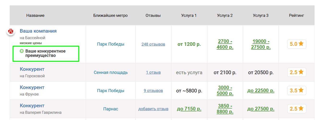 Если компания имеет конкурентные преимущества, мы можем их опубликовать на странице компании и показывать в таблицах в соответствующих страницах. Преимущества можно гибко настраивать для разных услуг. Правильная публикация преимуществ существенно увеличивает интерес клиентов, так как выделяет компанию в таблицах и показывает, почему следует обратиться именно туда.